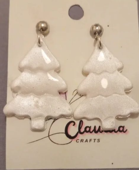 Arracades Neu Brillant. Arracades artesanes en forma d’arbre de Nadal, de color blanc amb purpurina brillant i tancament platejat. Elegants, lluminoses i ideals per a looks nadalencs delicats.