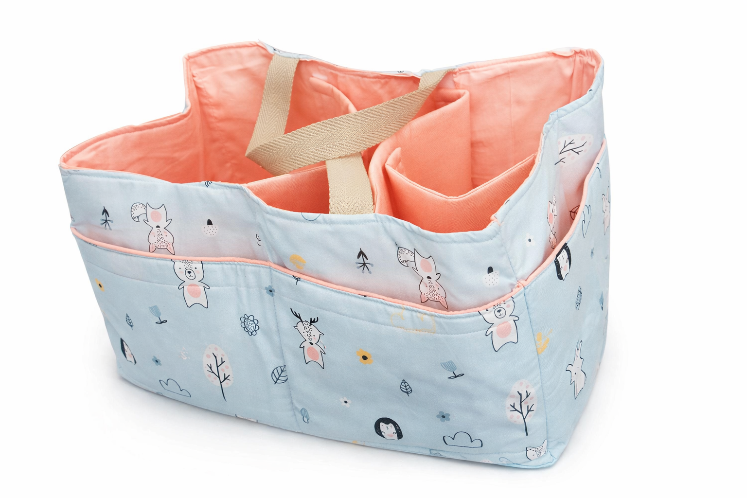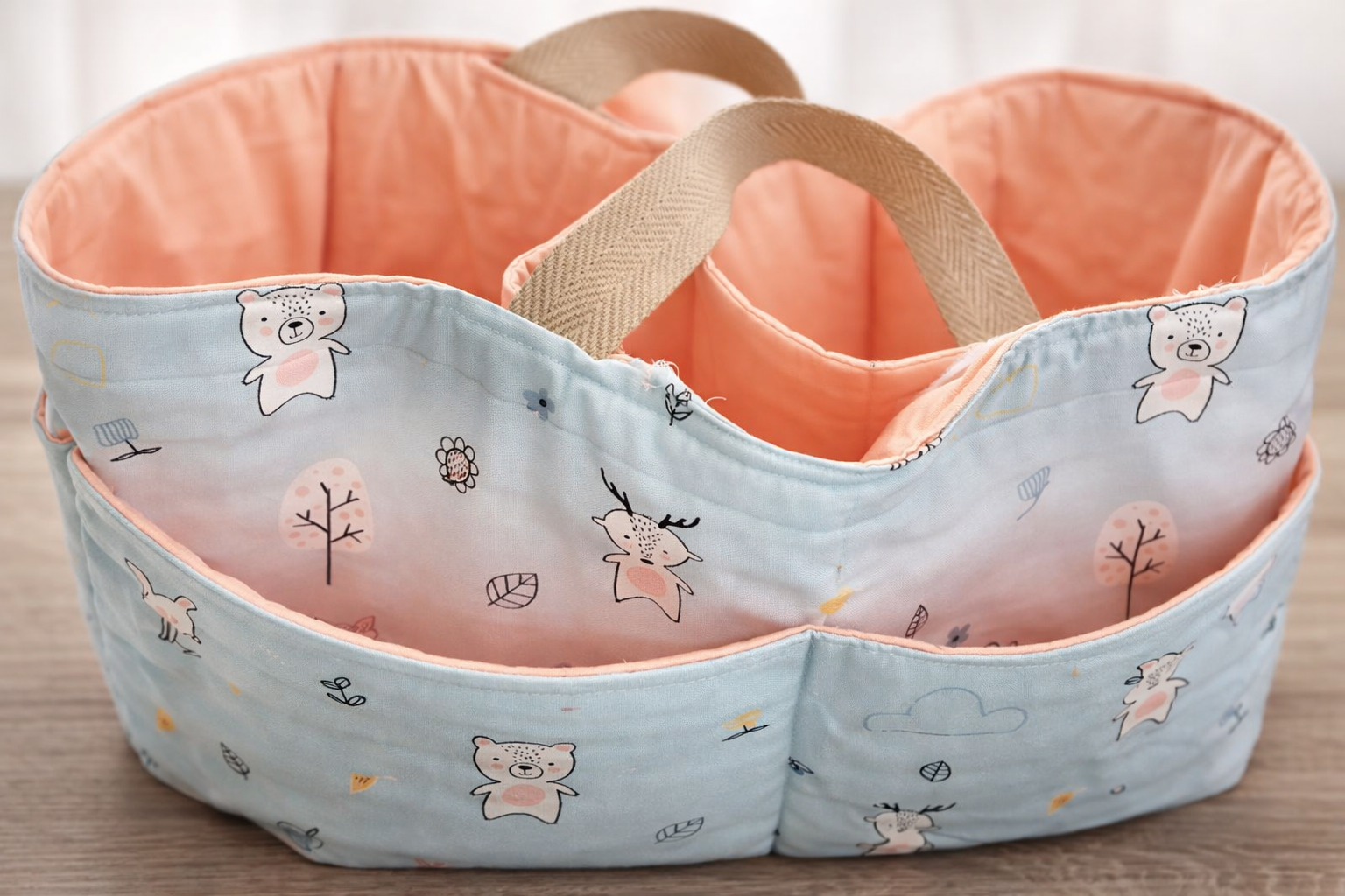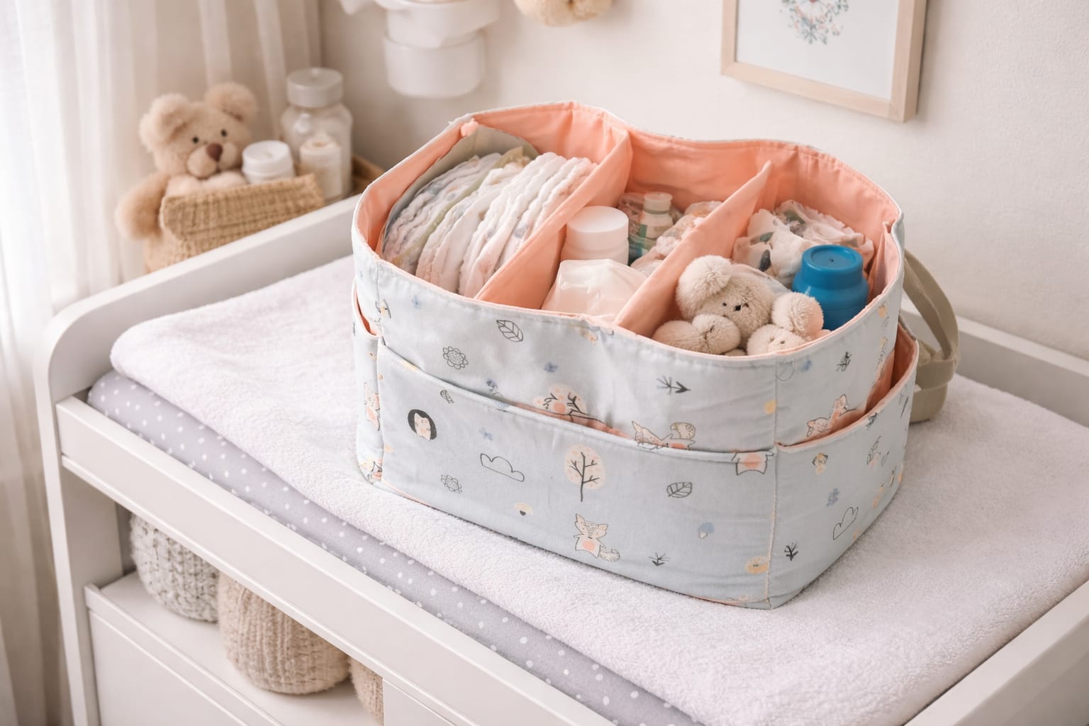 Feta a mà amb molt d’amor, és perfecta per guardar bolquers, tovalloletes, cremes, bodis i tot allò que necessites tenir sempre a punt, ja sigui al canviador, al menjador o a qualsevol racó de casa.