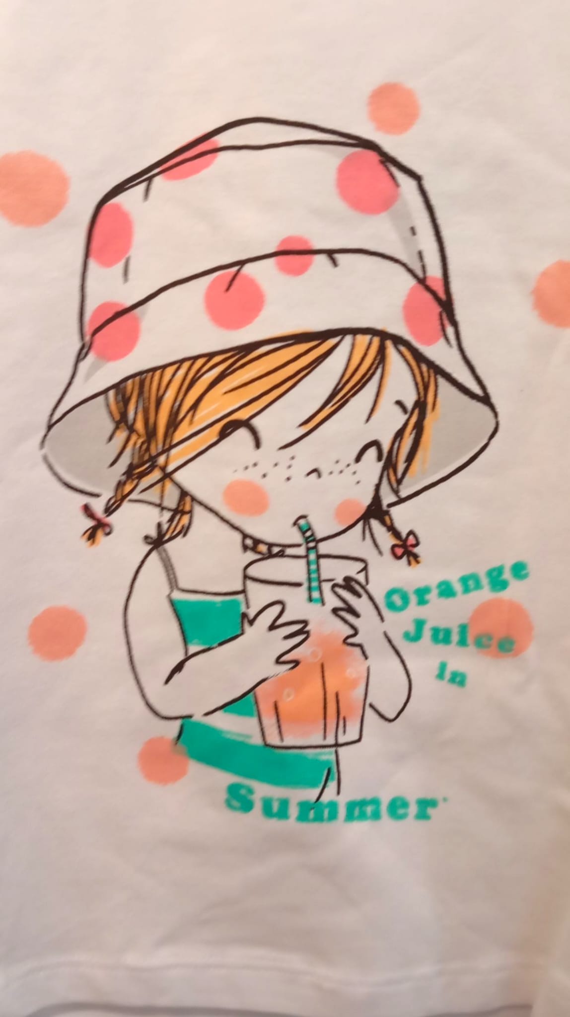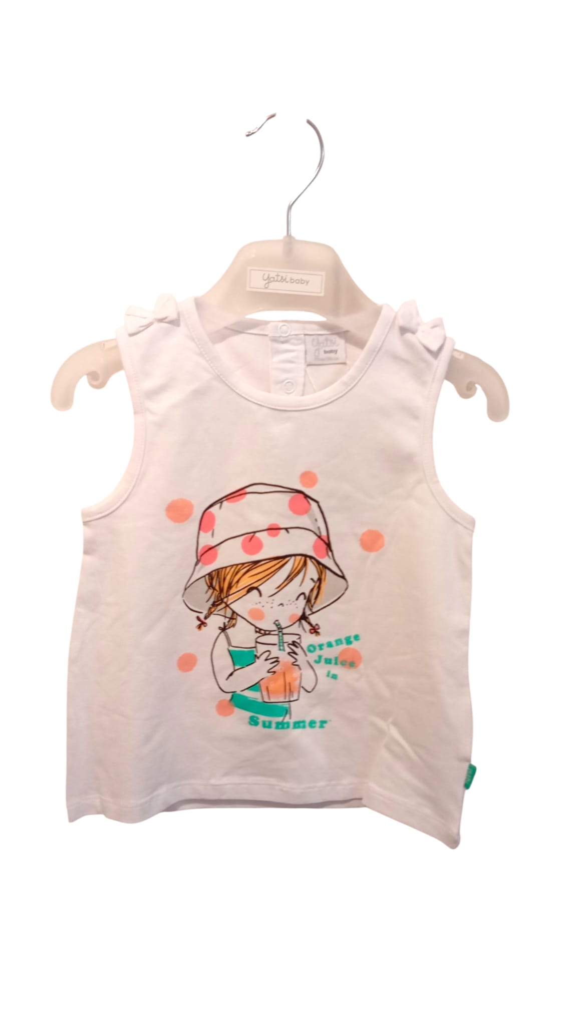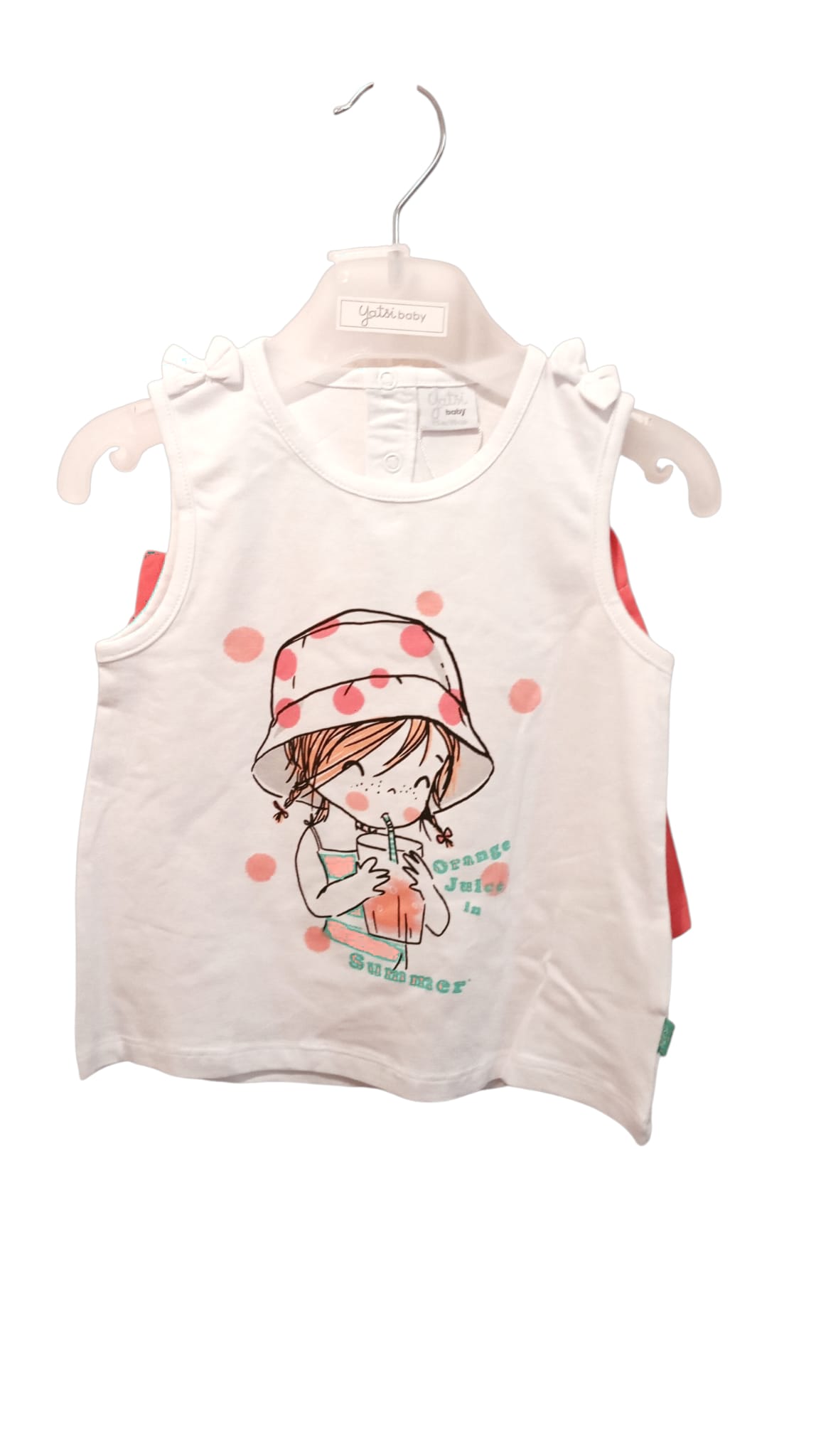Conjunt de samarreta de tirants i pantalons curts de punt. Samarreta: estampat Nena bevent un suc. Un llaçet sobre cada tirant. Obertura a la part posterior amb botons de pressió Pantalons llisos de color taronja salmó. Cintura elàstica. Fals llaç blanc.