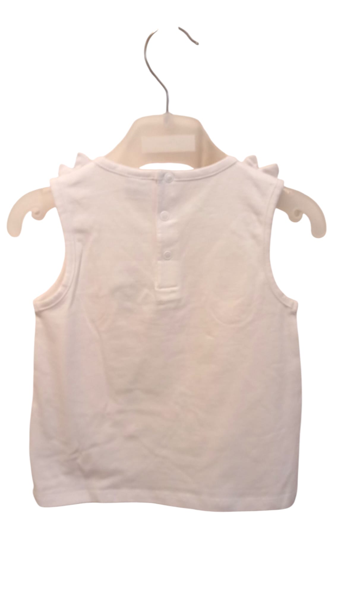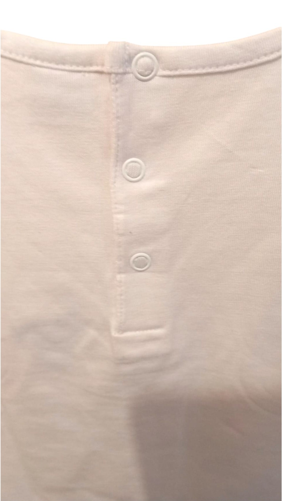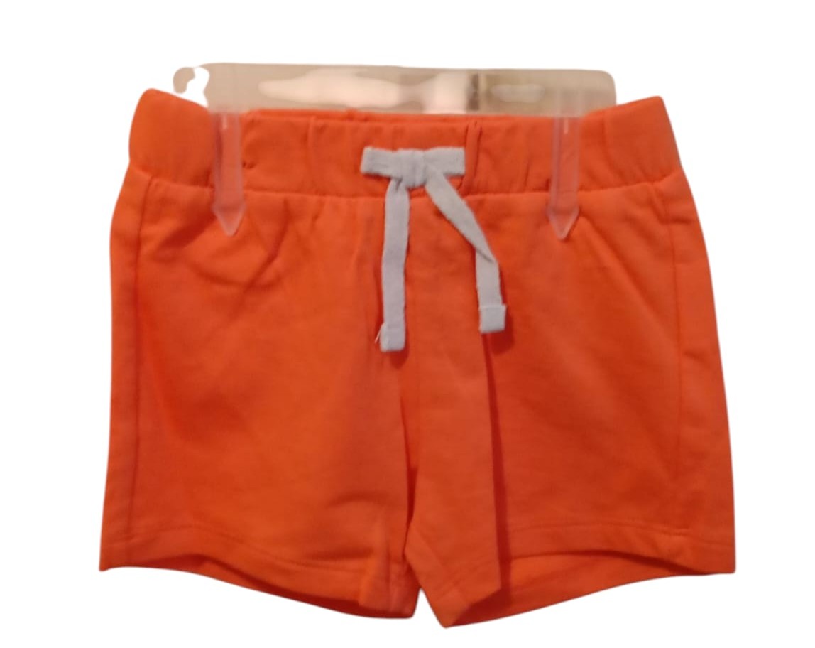 Conjunt de samarreta de tirants i pantalons curts de punt. Samarreta: estampat Nena bevent un suc. Un llaçet sobre cada tirant. Obertura a la part posterior amb botons de pressió Pantalons llisos de color taronja salmó. Cintura elàstica. Fals llaç blanc.