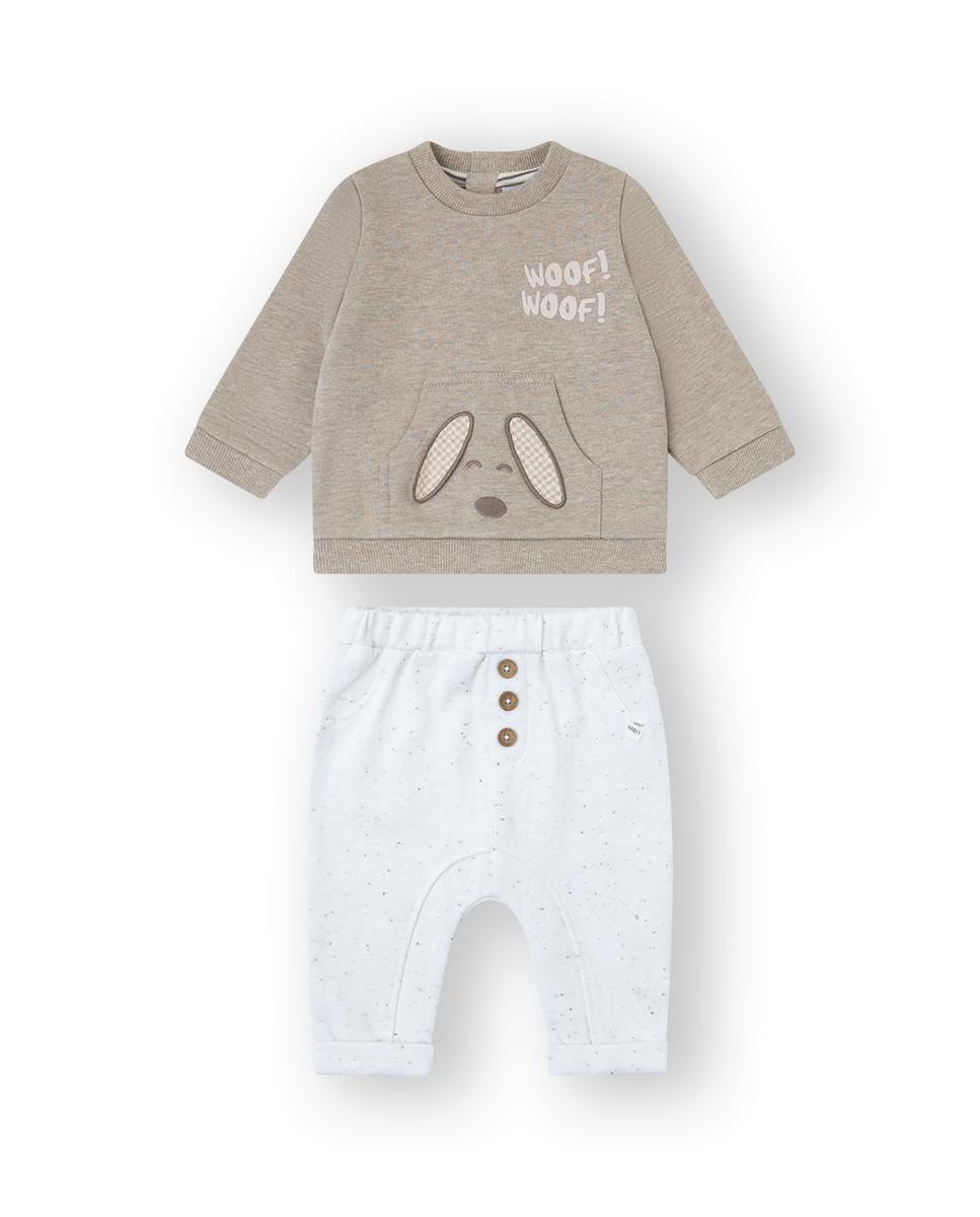 Conjunt nadó nen. Compost per: Dessuadora de pelfa amb butxaca amb brodat tipus cangur. Coll rodó ribetejat. Obertura posterior mitjançant claudàtors. Pantalons amb goma a la cintura i botons d’adornament. Color: Pedra