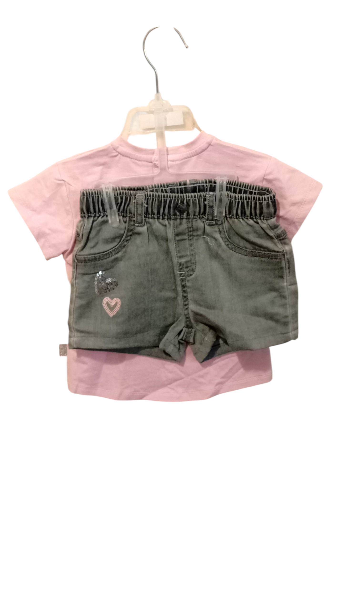 Conjunt de samarreta de màniga curta i pantalons curts texans en color gris.