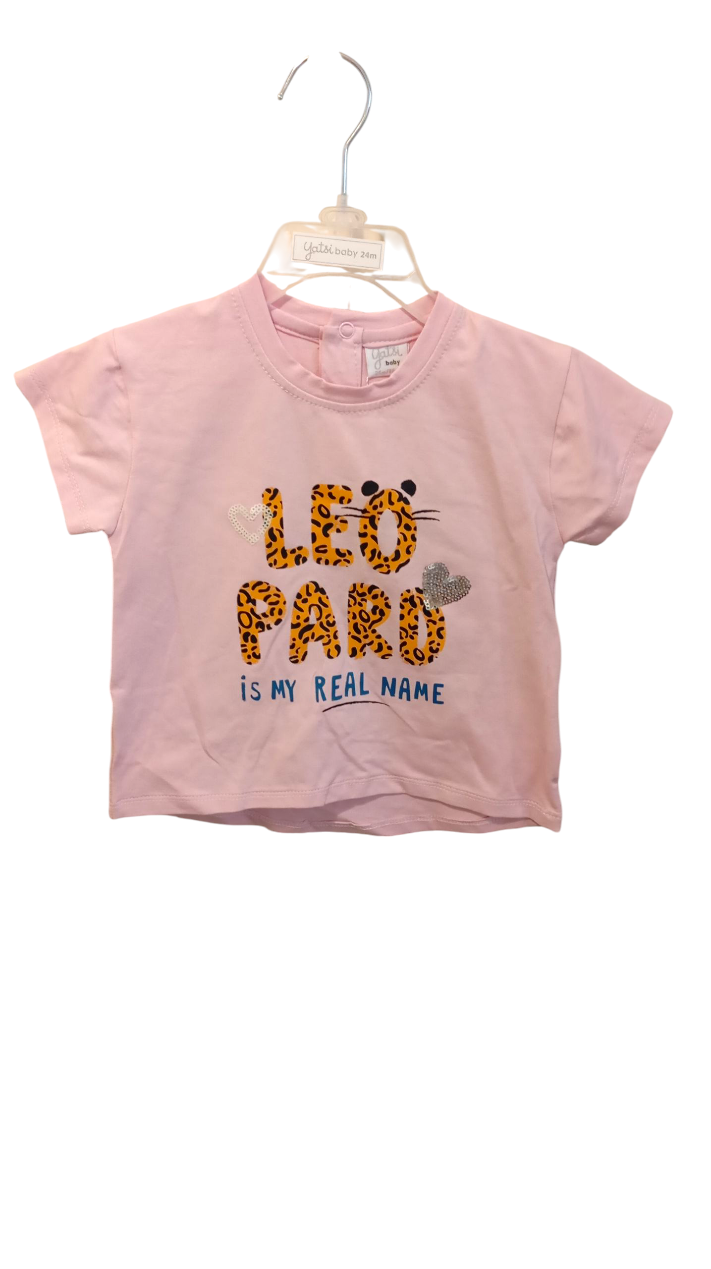 Conjunt de samarreta de màniga curta i pantalons curts texans en color gris. Samarreta amb impressió motiu “Leopard” i detalls en relleu. Pantalons curts texans en color gris amb detalls en relleu. Cintura elàstica. Samarreta amb obertura a la part posterior amb botons de pressió.
