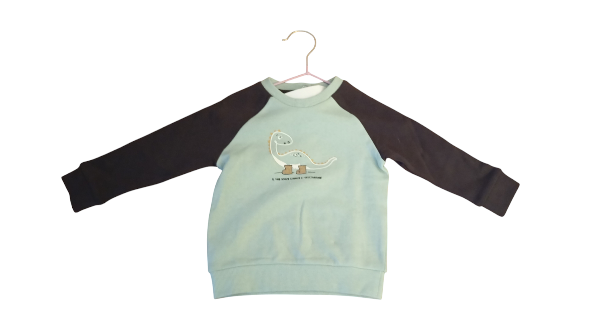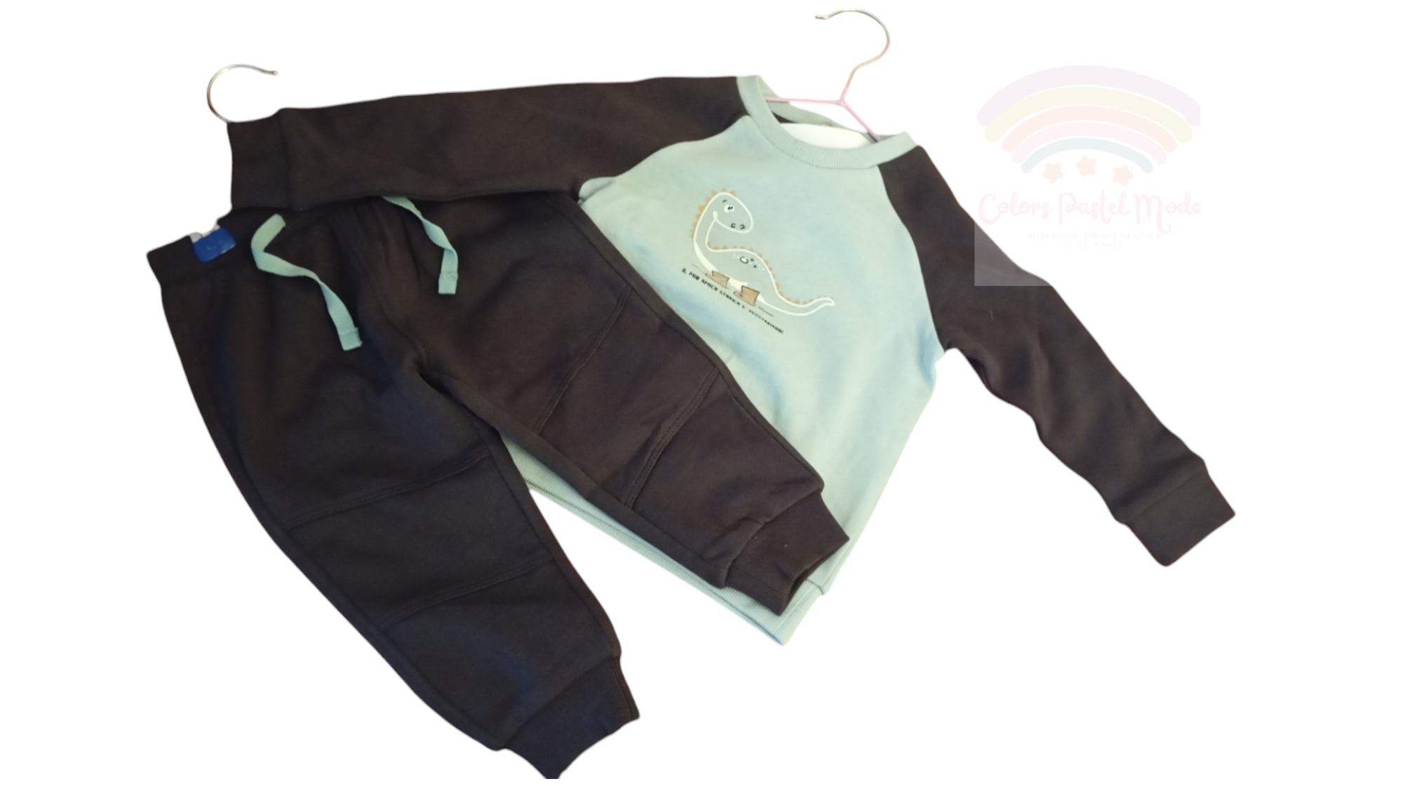 Conjunt de 2 peces: Dessuadora color blau clar i blau marí Estampat dinosaure Mànigues i cintura elàstica Botons a pressió a l’esquena per facilitar la posada de la peça Pantalons llargs de color blau marí Cintura elàstica amb cordons ajustables Diferents talles disponibles