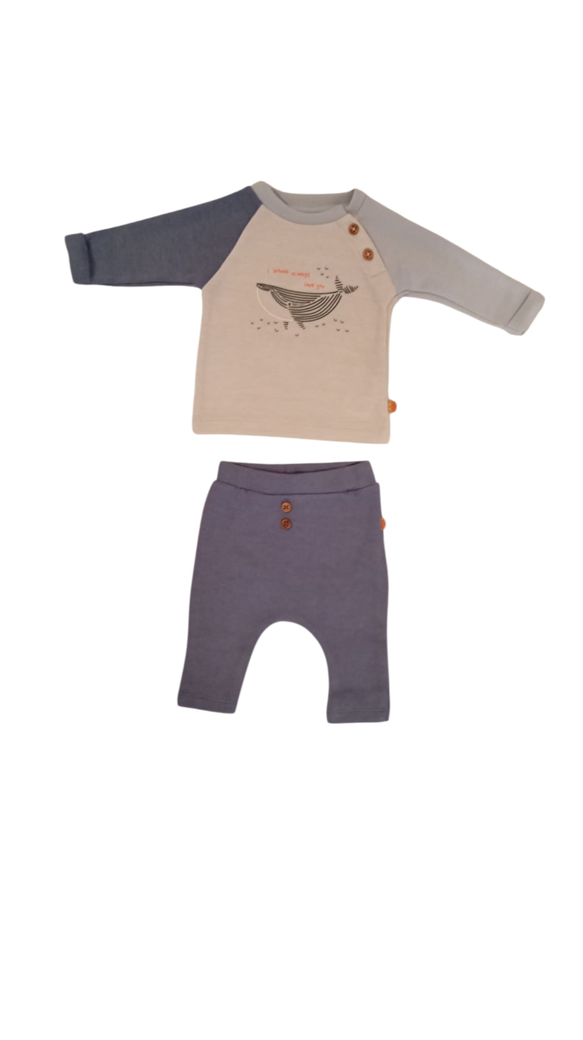 Conjunt nadó nen Ocean. Compost per: Dessuadora amb dibuix a davant. Coll rodó amb dos botons al costat esquerre. Obertura posterior mitjançant claudàtors. Pantalons blau marí amb goma a la cintura.