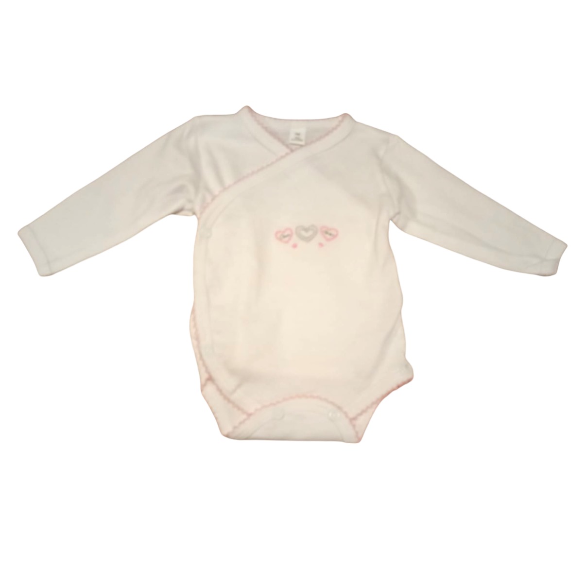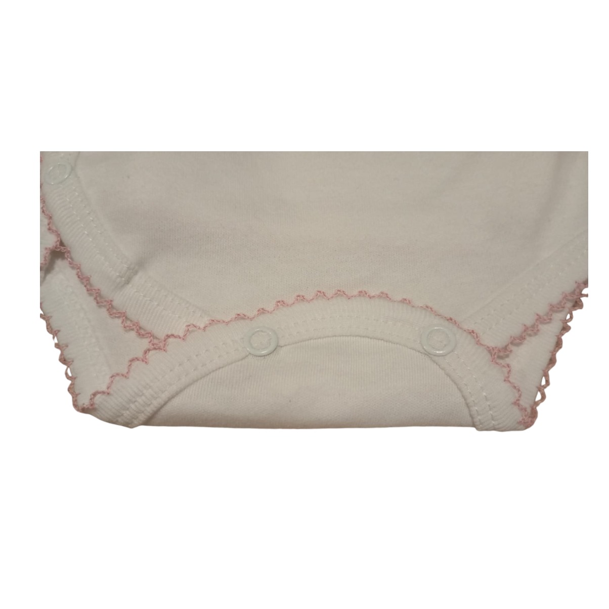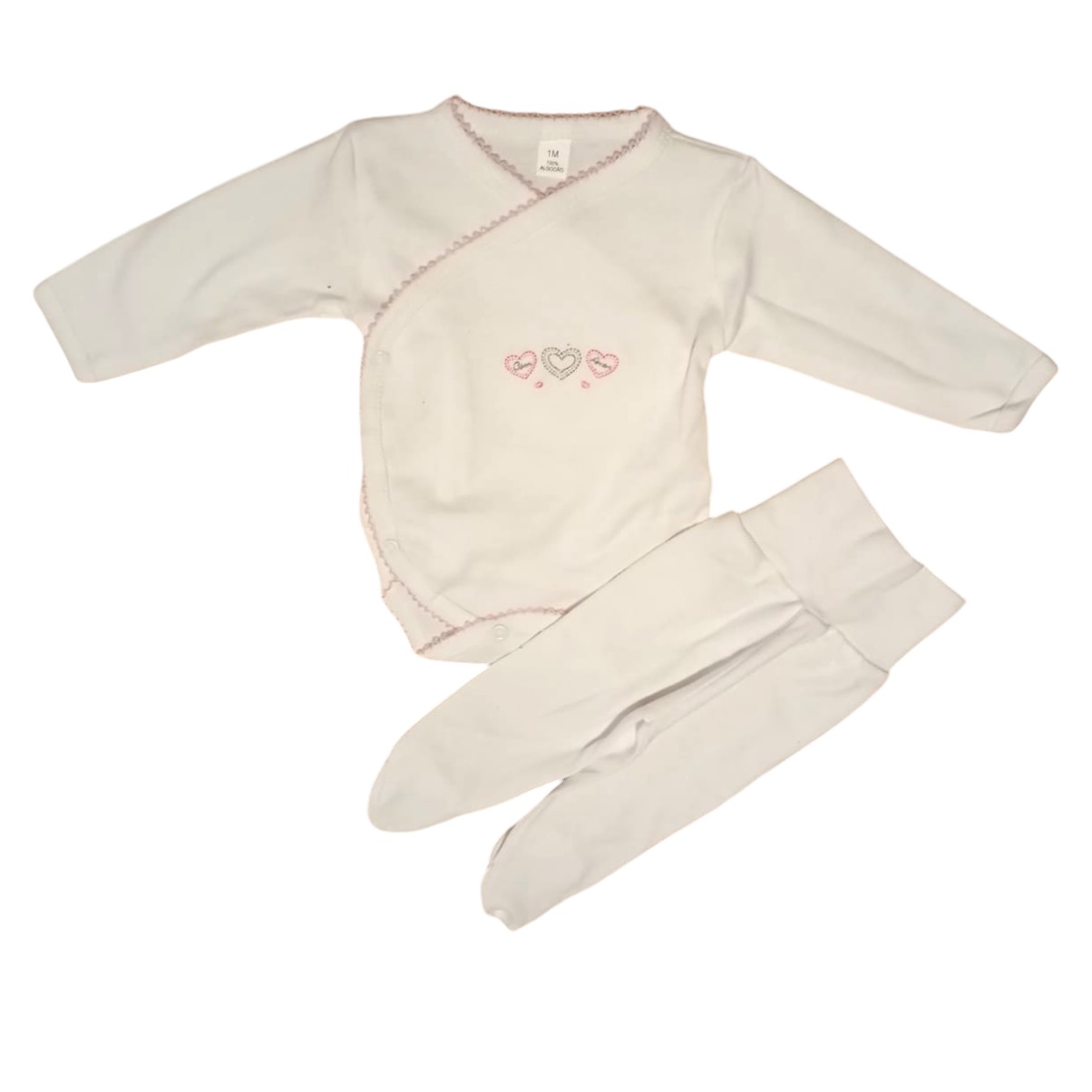 Conjunt de primera posada de màniga llarga de cotó 100%: Body blanc amb detalls de color rosa de màniga llarga. Pantalons blancs amb goma amb peus tapats. Botons a pressió en el body. Talla 1m