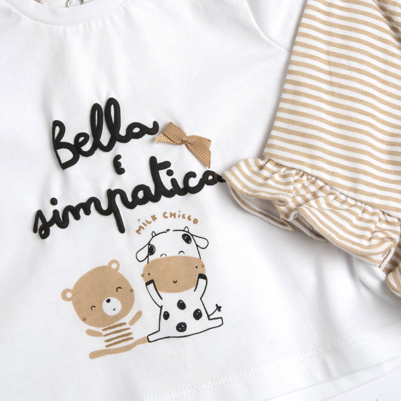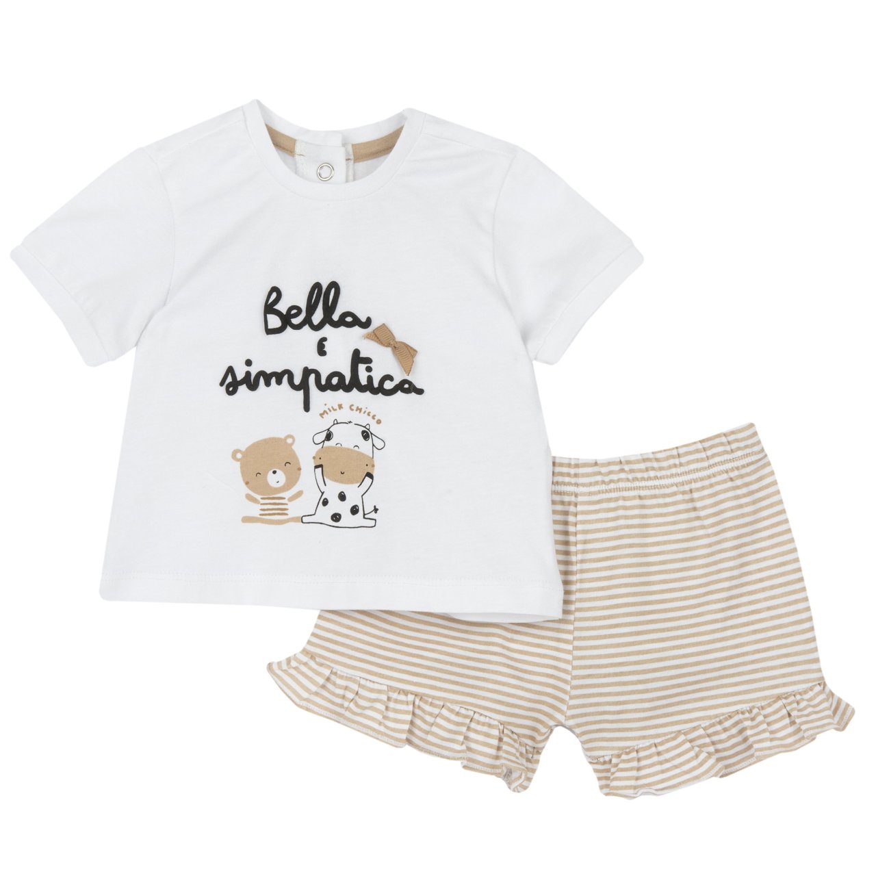 Conjunt de samarreta de màniga curta amb coll rodó i pantalons curts de punt estampat. Els nens creixen i Chicco creix amb ells. Impressió d’animals amb detalls amb relleu. Pantalons curts estampats amb ratlles. Cintura elàstica. Samarreta oberta amb botons automàtics. Producte amb certificació Oeko-Tex: la qualitat per al teu nadó.