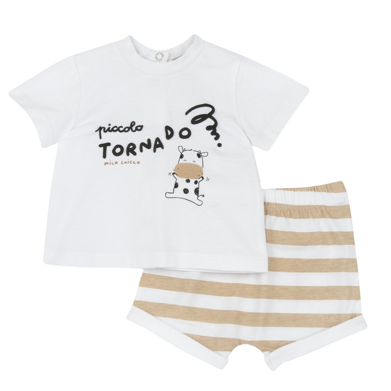 Conjunt de samarreta de màniga curta i pantalons curts de punt de cotó. Els nens creixen i Chicco creix amb ells. Pantalons curts amb estampat de ratlles. Gràfic imprès a la samarreta. Samarreta de màniga curta amb obertura a l’esquena amb botons a pressió. Producte amb certificació Oeko-Tex: qualitat per al teu fill/a.