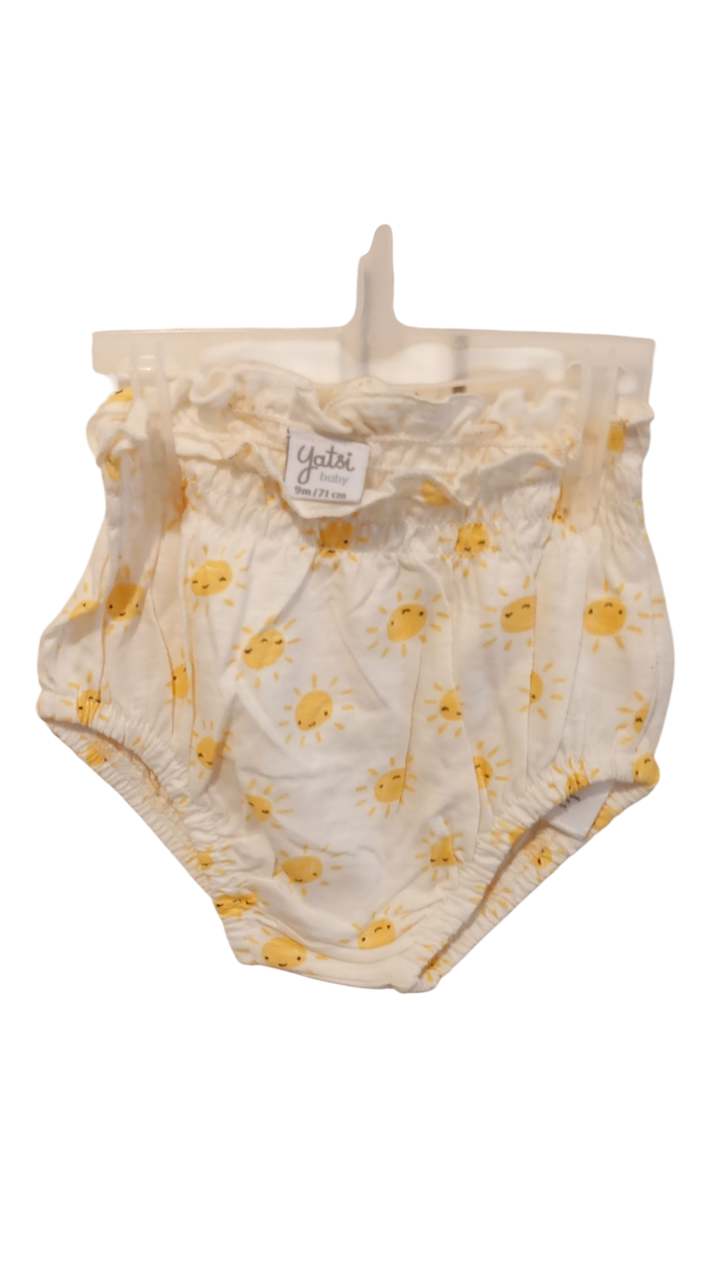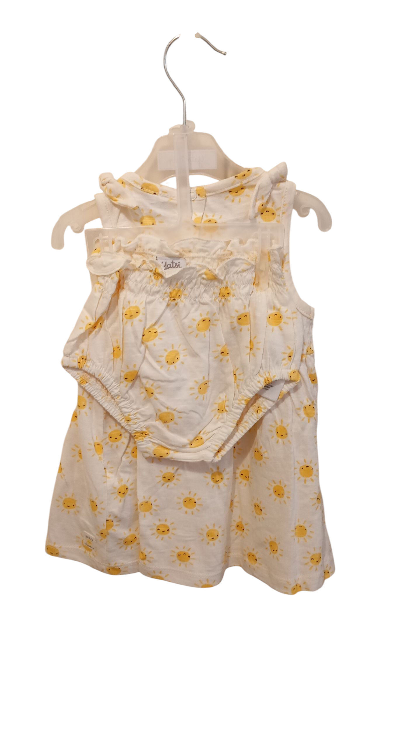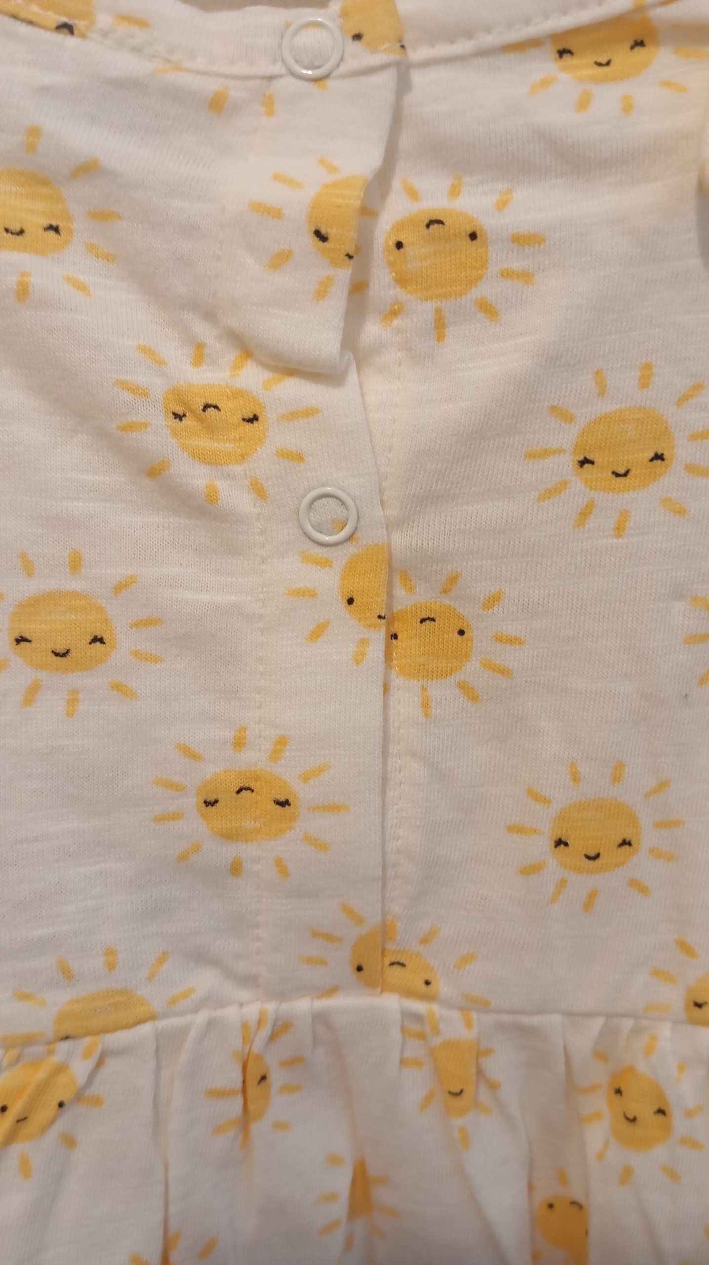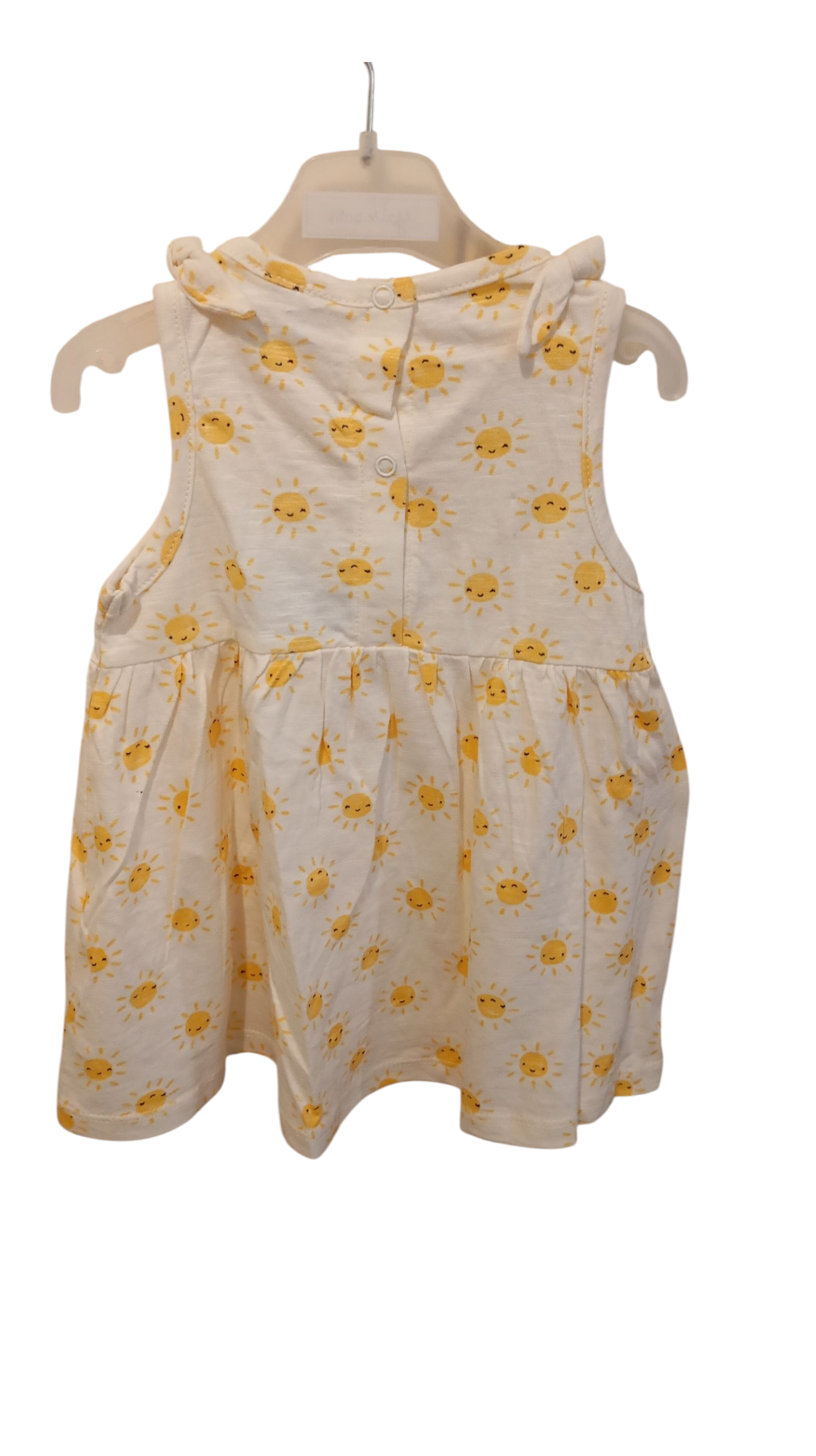 Conjunt de vestit de tirants amb celcetes de punt estampat. Vestit amb estampat de sols “sunny” Obertura a la part posterior amb botons de pressió Cintura elàstica Calcetes amb el mateix estampat del vestit.
