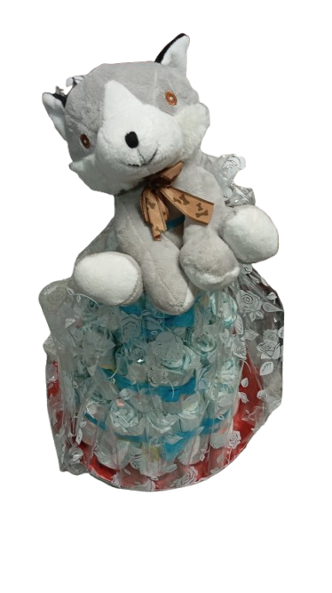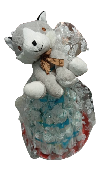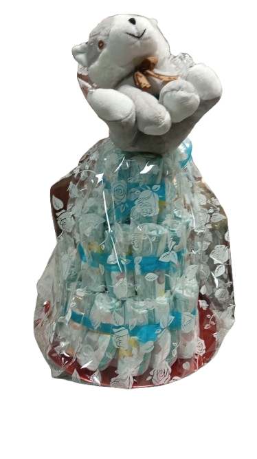 Espectacular pastís de bolquers de 3 pisos amb un Osset de peluix. Poden variar, el model del peluix i de cintes. Contingut: 40 bolquers marca DODOT Talla 3 ( de 3-10 kg) Osset de peluix. Mides: alt 86x ample 31 x fundària 36 cm.