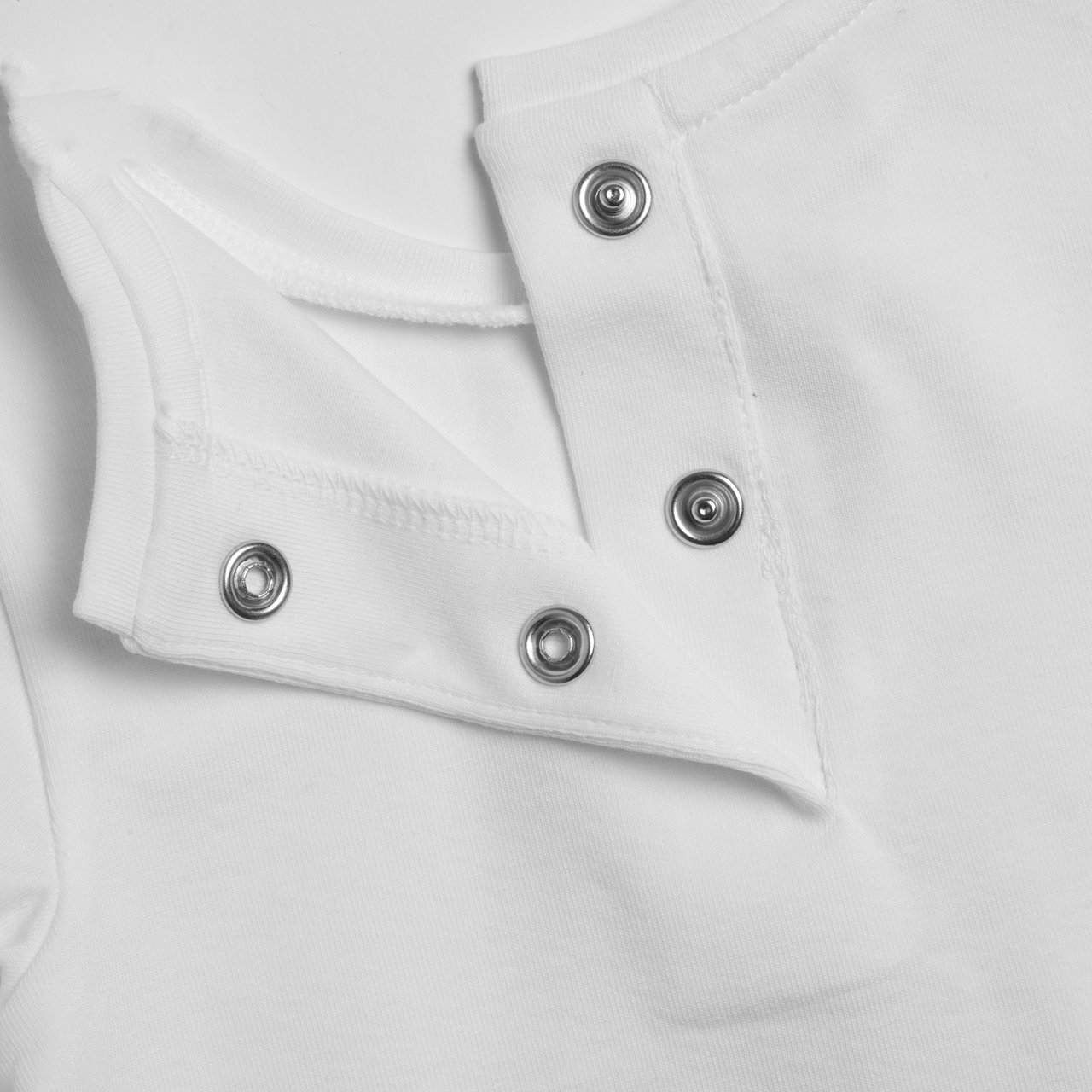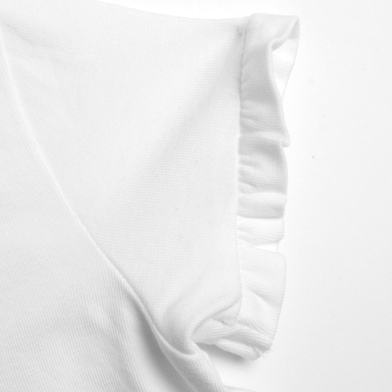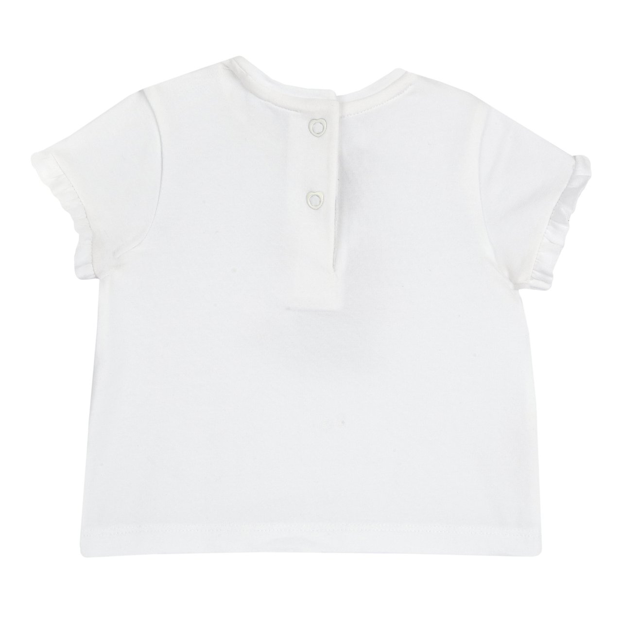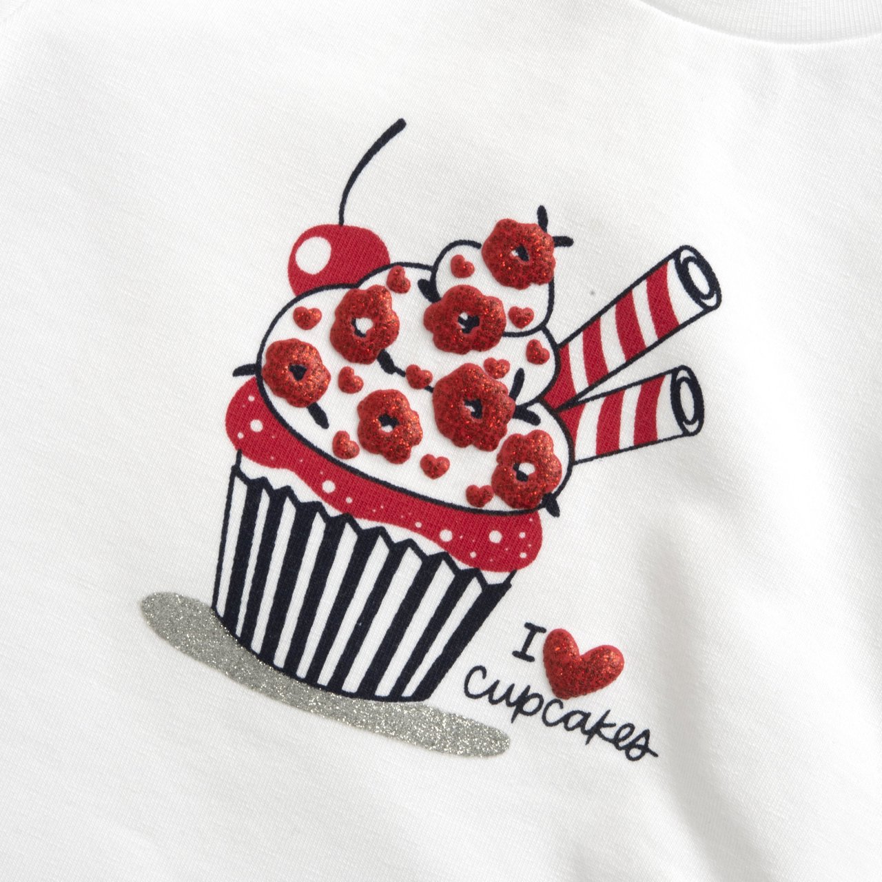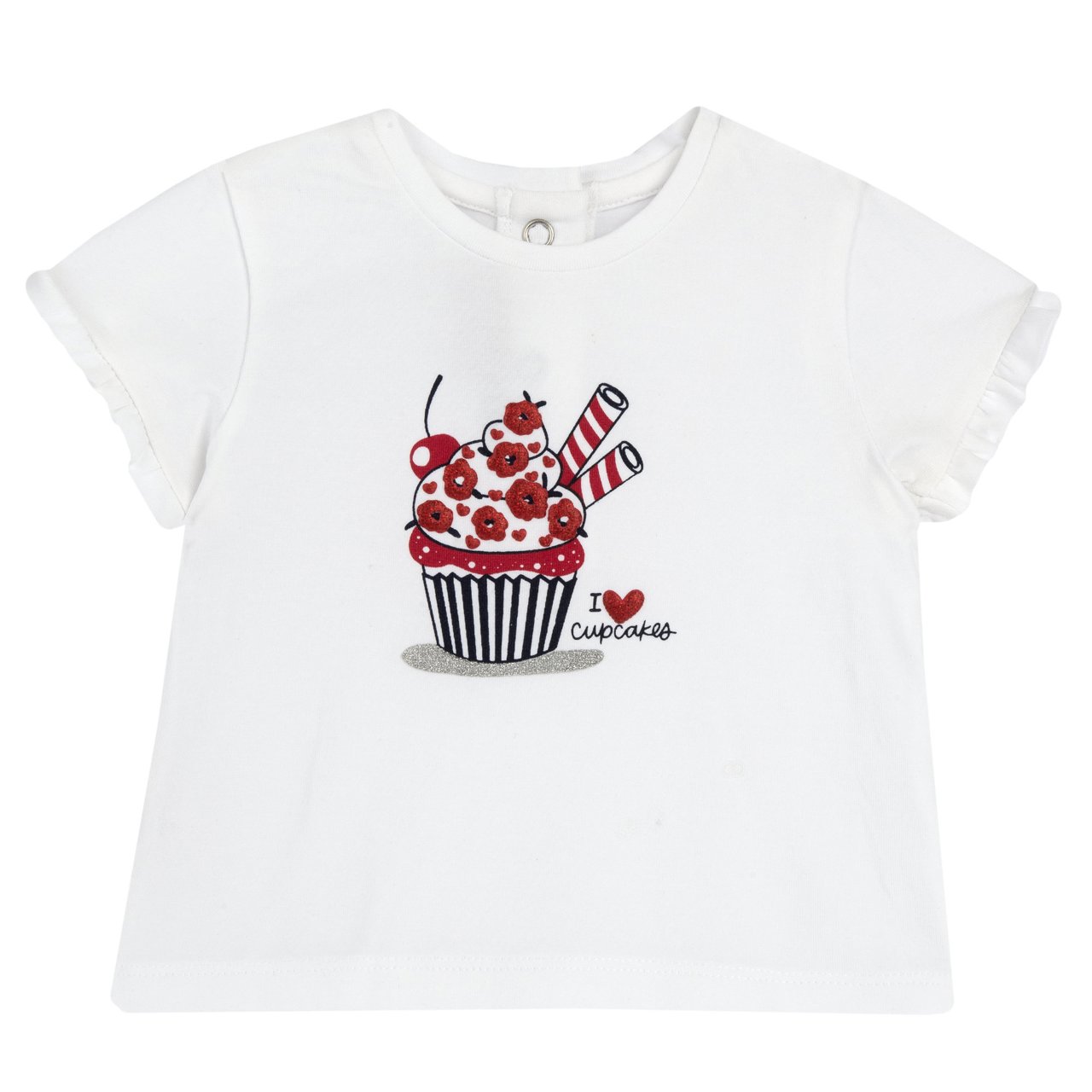 Samarreta de màniga curta de punt de cotó elàstic. Els nens creixen i Chicco creix amb ells. Estampat de cupcake amb efecte en relleu. Màniga amb volants. Cotó sostenible. Obertutra a la part posterior amb botons automàtics.