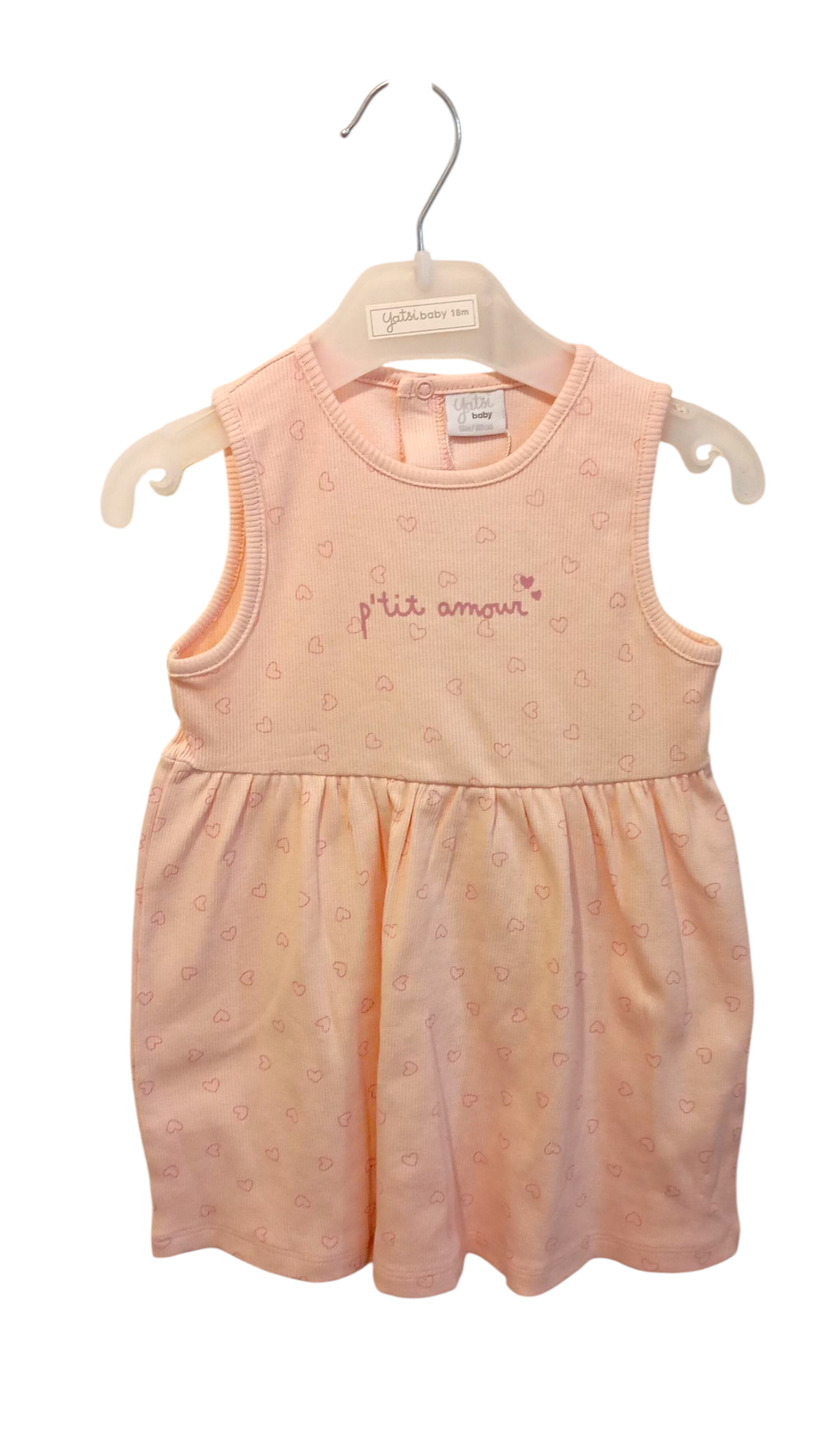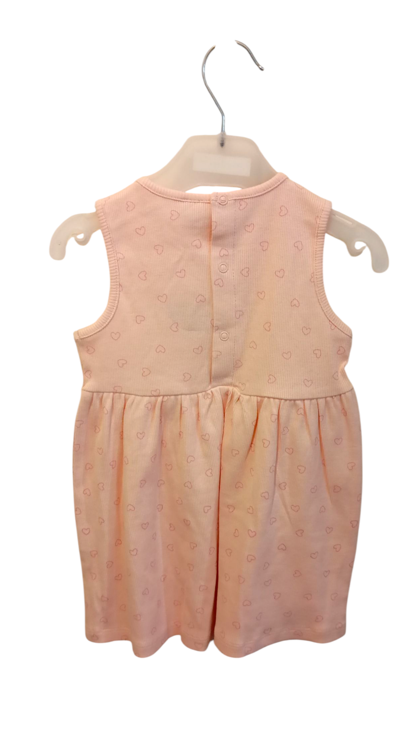 Vestit Rosa de punt de cotó elàstic. Estampat de cors Tirants Coll rodó Obertura a la part posterior amb botons de pressió.