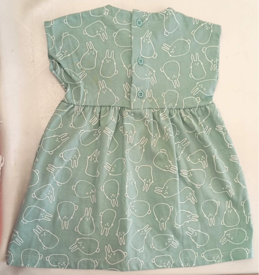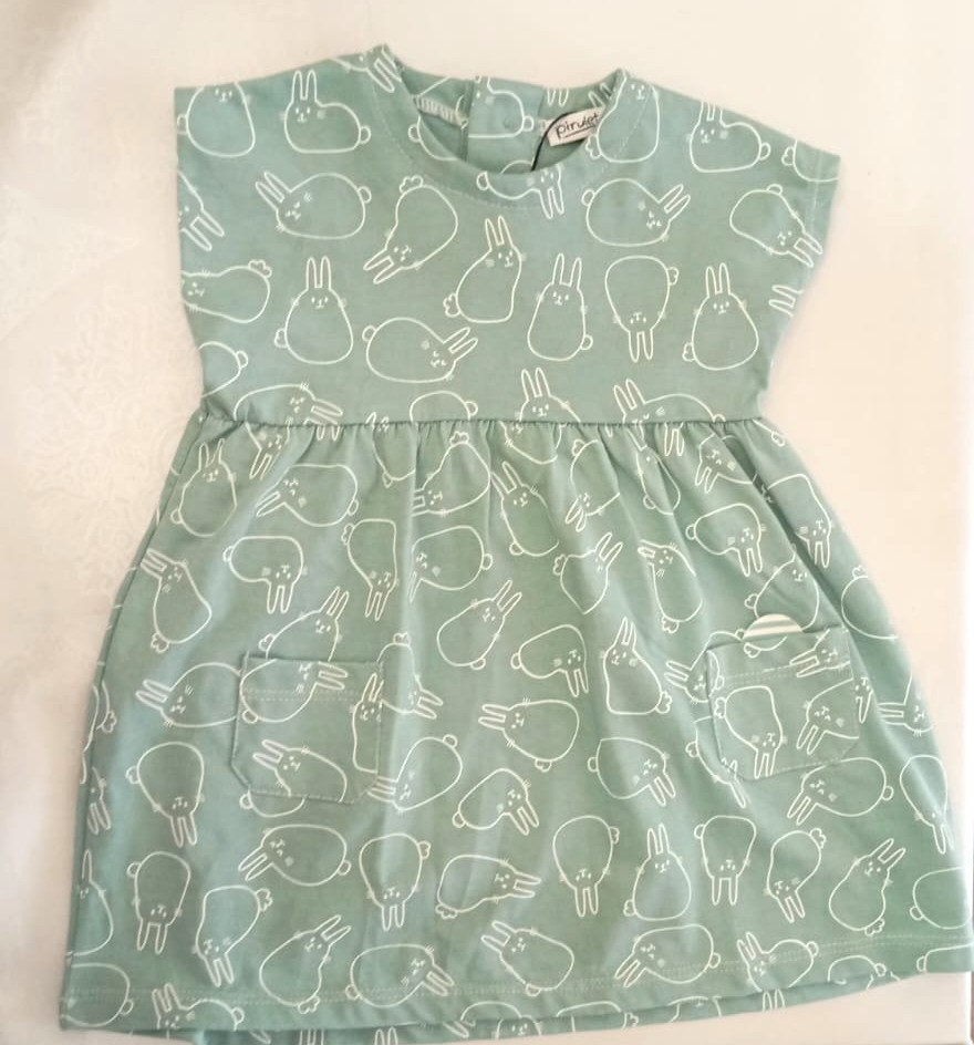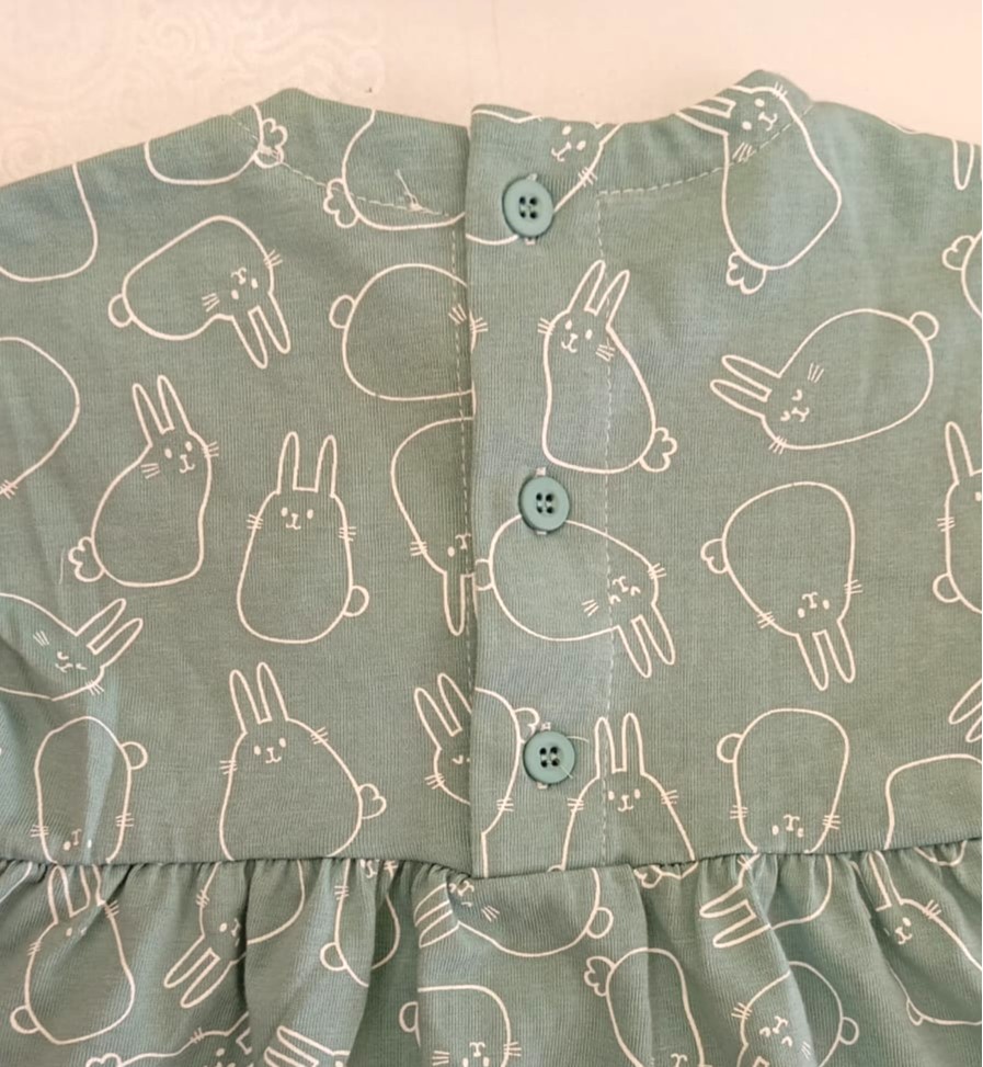 Vestit estiu de punt. Estampat amb conills. Color Turquesa Cintura elàstica. Màniga curta Obertura a l’esquena amb botons.