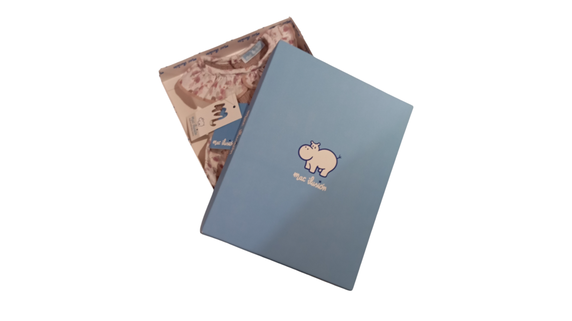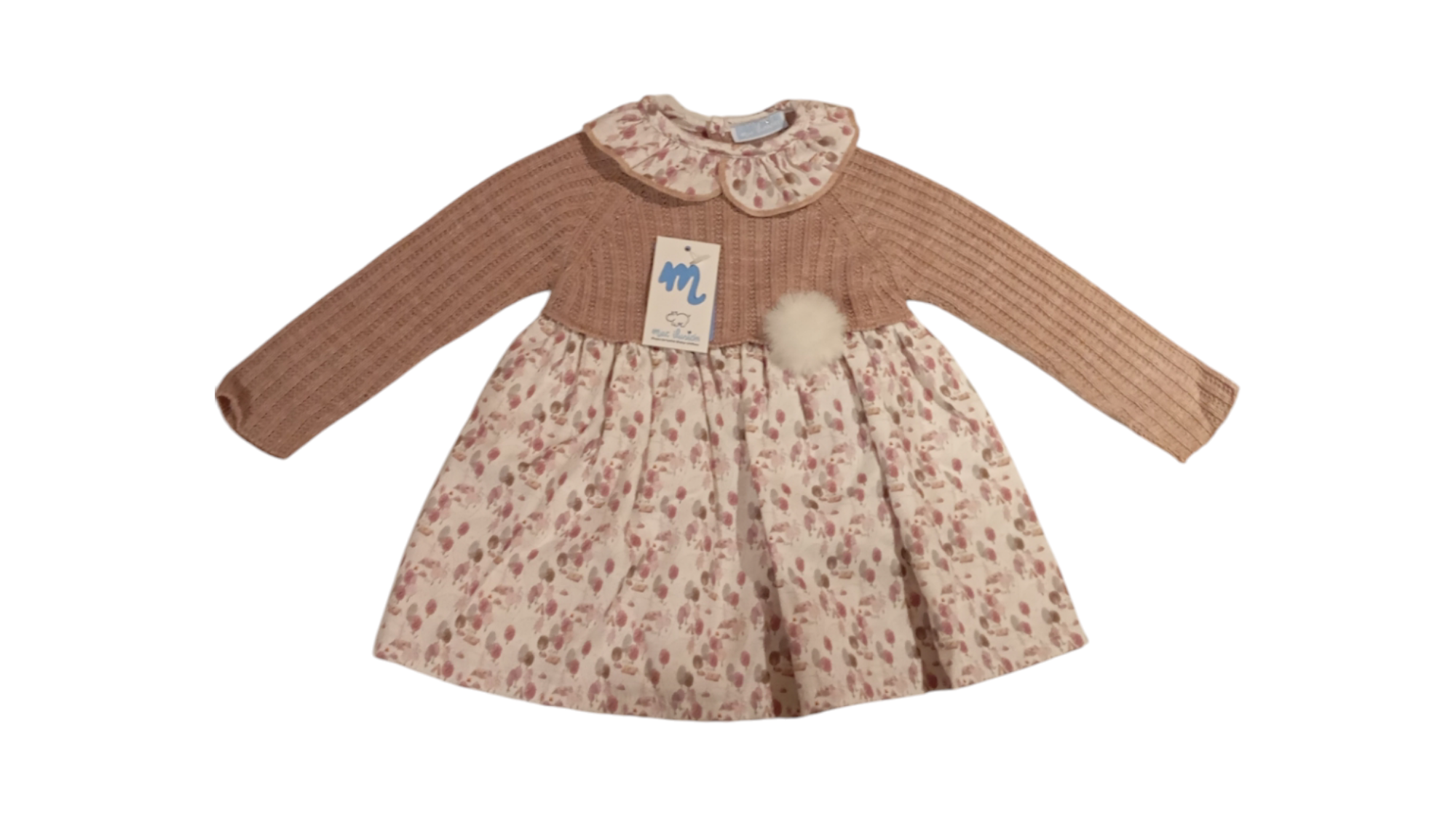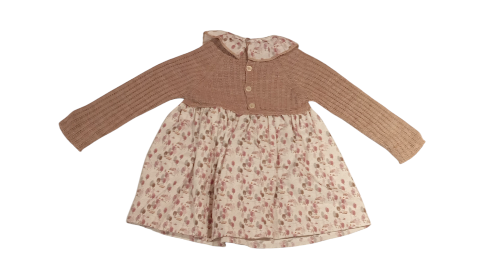 Vestit de punt-tela muselina Mac Ilusion: Part  superior de punt de color rosa amb volants al coll. Màniga llarga Tancament amb botons a l’esquena per facilitar la posada de la peça Part inferior tela de muselina. Talla 12m Presentació amb caixa de la marca.