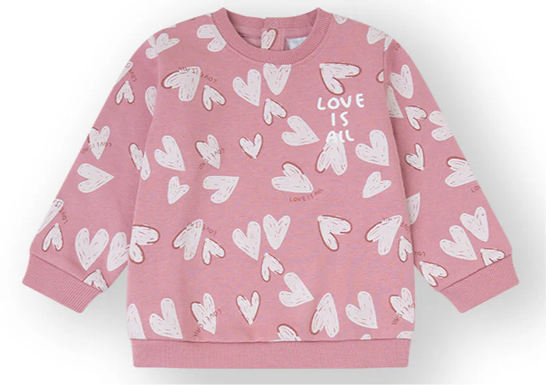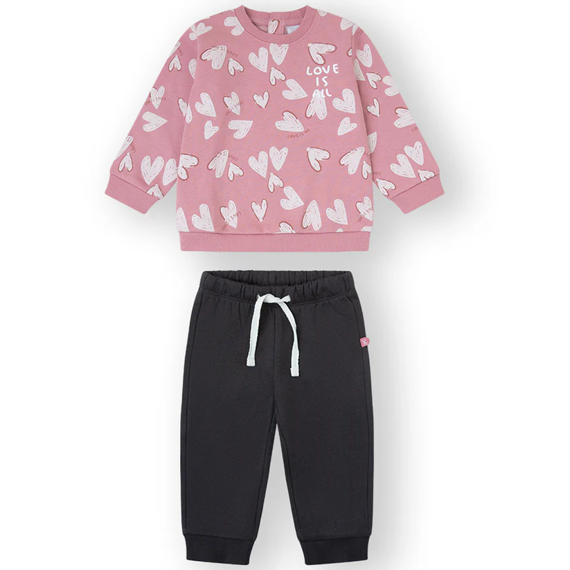 Preciós xandall per a bebè nena. Compost per: Dessuadora color rosa amb molts cors. Coll rodó. Amb petita obertura per darrere per facilitar el posar i treure. Elàstics als punys de les mànigues. Pantalons gris fosc, amb elàstic als puny i goma a la cintura. Un preciós conjunt pels nostres petits. Composició: 60% cotó 40%…